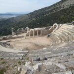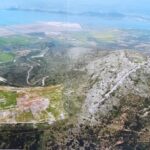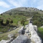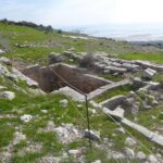 Wir machen gleich einmal einen Radausflug nach Nea Pleurona, eine Stadt von 230 v.Chr. Die Anfahrt besteht aus 7km ebener Strecke und steigt dann 3km sehr steil an. Recht anstrengend für uns untrainierte Winterlager-Sitzer, aber es lohnt sich. Der Rundgang im antiken Ruinenfeld im beginnenden Frühling durch blühende Wiesen ist sehr schön, die Aussicht auf die Lagune ist toll, und ausser uns beiden ist niemand da. Auf den höheren Berggipfeln des Peloponnes liegt noch reichlich Schnee.